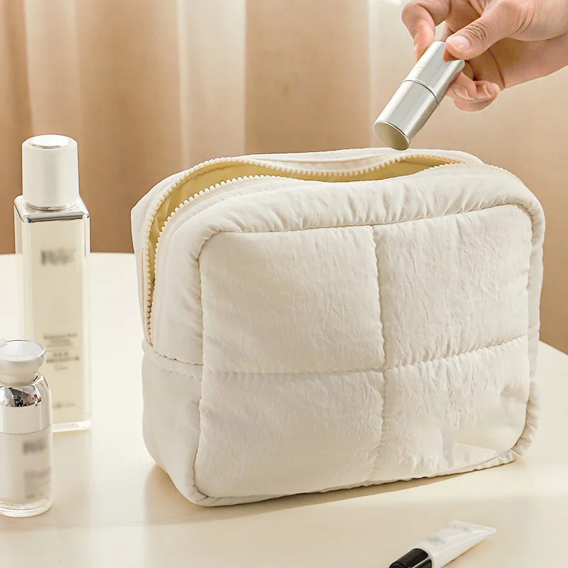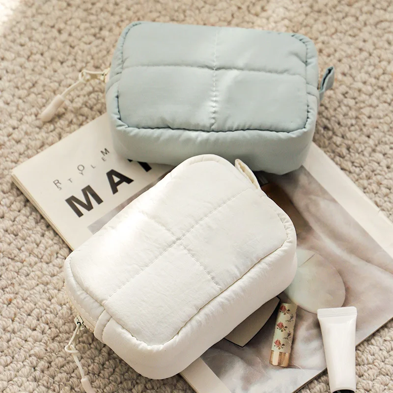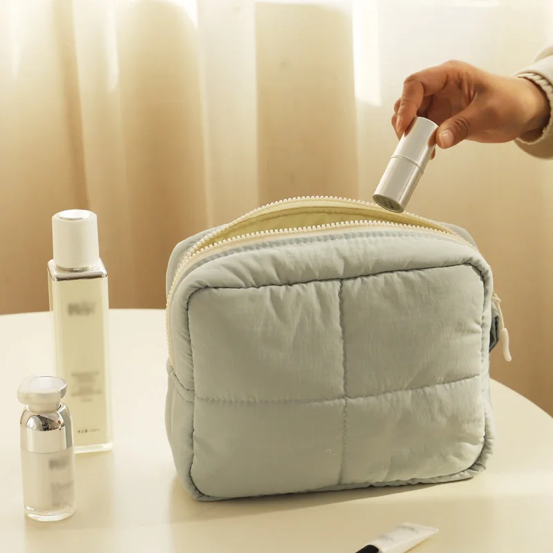 Custom Logo Polyester Puffer Cosmetic Storage Bag Waterproof Toiletry Organizer Bag Portable Quilted Makeup Bag for Travel